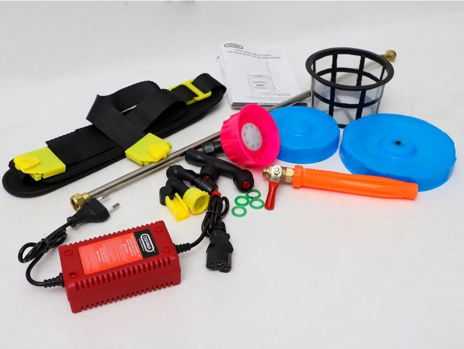 – Phụ tùng đi kèm : Lọc rác, Dây đeo, Cần phun, Tay cầm van bi, Bộ béc phun nhựa 4 béc, Cần 3 bec inox, Nắp bình nước, Bộ sạc, Dây nước 2 đầu răng.